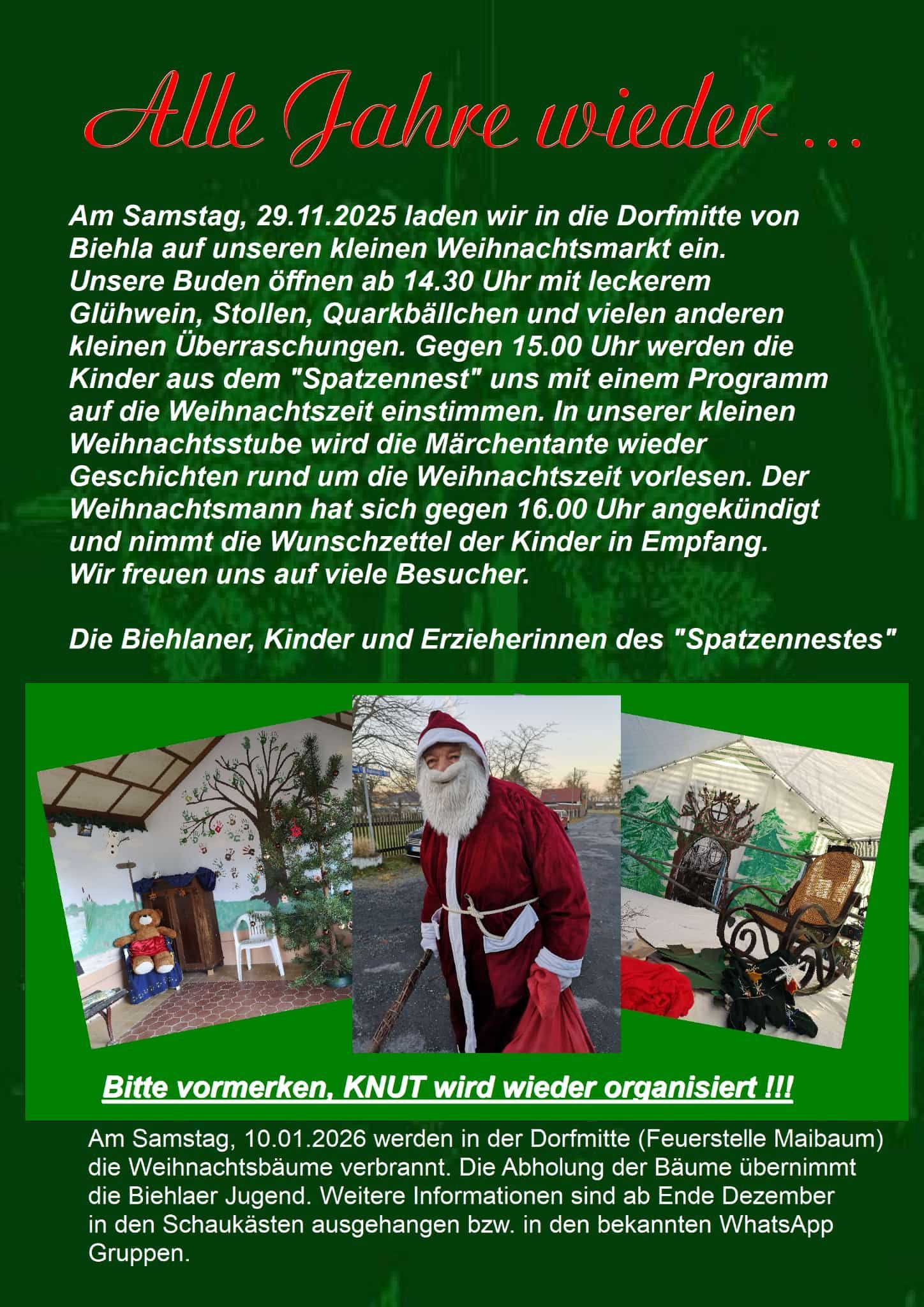 Den Abschluss des Jahres bildete immer unser kleiner Weihnachtsmarkt mit dem Anzünden des Lichterbaums in der Dorfmitte. Hier erfreuten uns die Kinder des Kindergartens Spatzennest mit einem kleine Programm und bei Glühwein, Bratwurst und anderen Leckereien stimmten wir uns alle auf die Adventszeit ein.