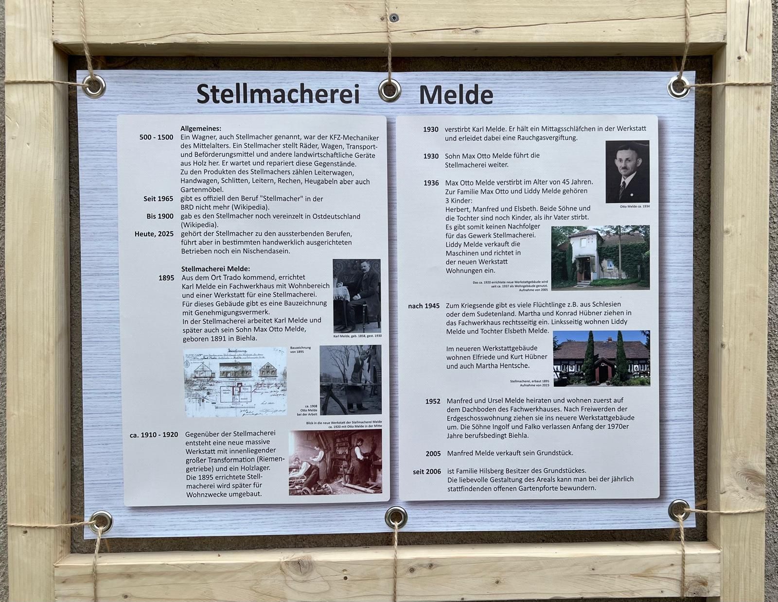 Die ehemalige Stellmacherei Melde blickt auf eine lange Handwerkstradition zurück. Schon 1895 wurde hier von Karl Melde eine Werkstatt für den Bau von Wagen, Schlitten und landwirtschaftlichen Geräten betrieben. Später führte Sohn Max Otto Melde das Handwerk weiter, bis es über mehrere Generationen hinweg in Familienhand blieb.